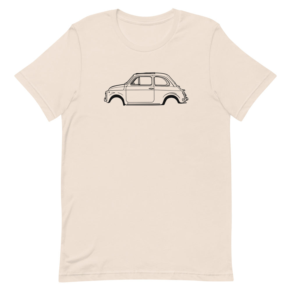 Ce t-shirt doux, léger et confortable vous fera paraître à votre meilleur dans toutes les situations tout en s'inspirant de la plus connue des petites citadines italiennes, la Fiat 500 (mk1).